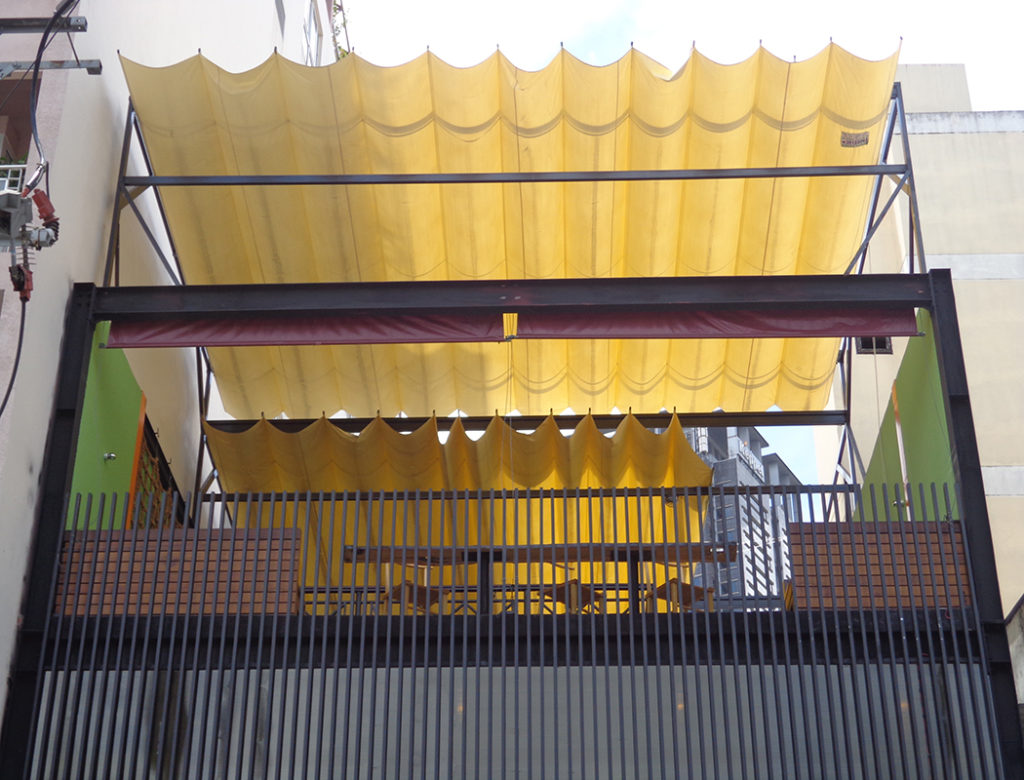 – Toàn bộ không gian hiện hữu do được che phủ bởi nhiều cây xanh rất mát ánh sáng yếu.lên chúng tôi đã lựa chọn cho khách hàng mẫu BẠT MÁI XẾP có gam màu sáng phản quang giúp tăng độ sáng cho quán không bị cảm giác âm u.và hiệu quả thật tuyệt vời vì dù có mái che nhưng quán vẫn sáng và thông thoáng như lúc ban đầu. đặc biệt nhờ khả năng di động mái có thể kéo ra và xếp vô được lên những lúc không có mưa hay nắng chỉ một thao tác nhẹ nhàng chưa đầy 5 giây mái đã xếp lại gọn gàng trả lại hoàn toàn không gian tự nhiên ban đầu rất tiện lợi.