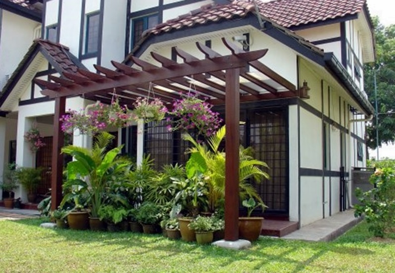 Giàn hoa mái hiên trước nhà bằng gỗ
